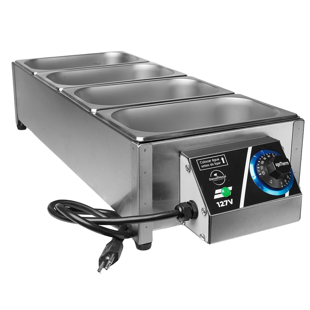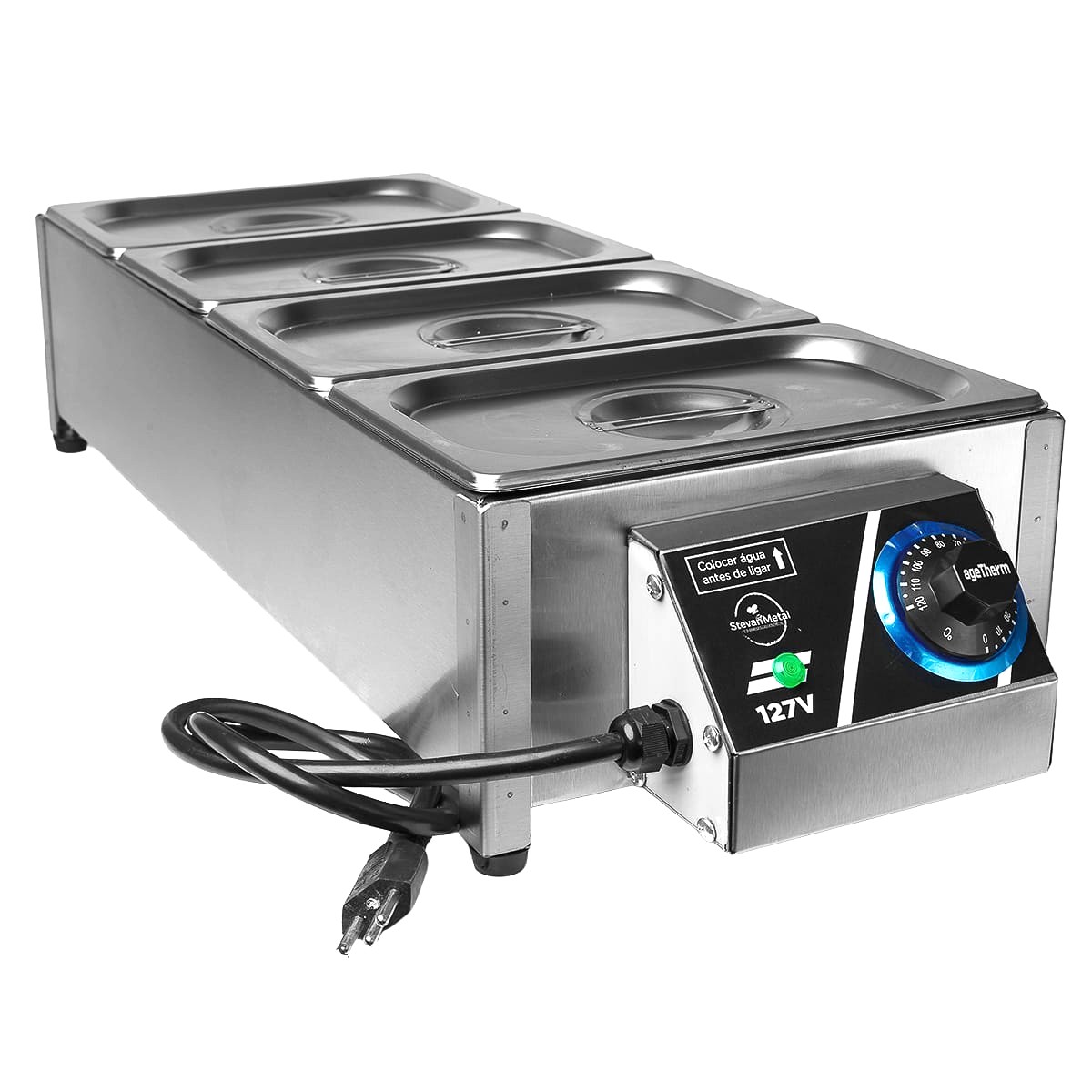 2000w 220V ou 127V Aço Inox Escovado 4 Cubas GN 1/4 X 100mm Termostato Regulagem 20-120° Tampas estampadas
